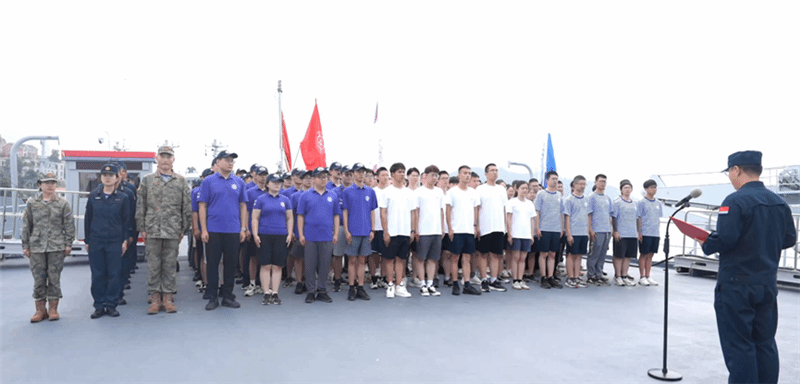 8月6日下午,同学们参加了离码头部署,全体学员统一着救生衣在甲板列队站泊,学习港口航法,观摩码头部署,了解到舰艇的每个看似简单的行为,背后都离不开全体官兵的齐心协作和紧密配合。随后郑和舰便开启了在茫茫大海上的航行,同学们与舰艇一道乘风破浪,挺进深蓝。