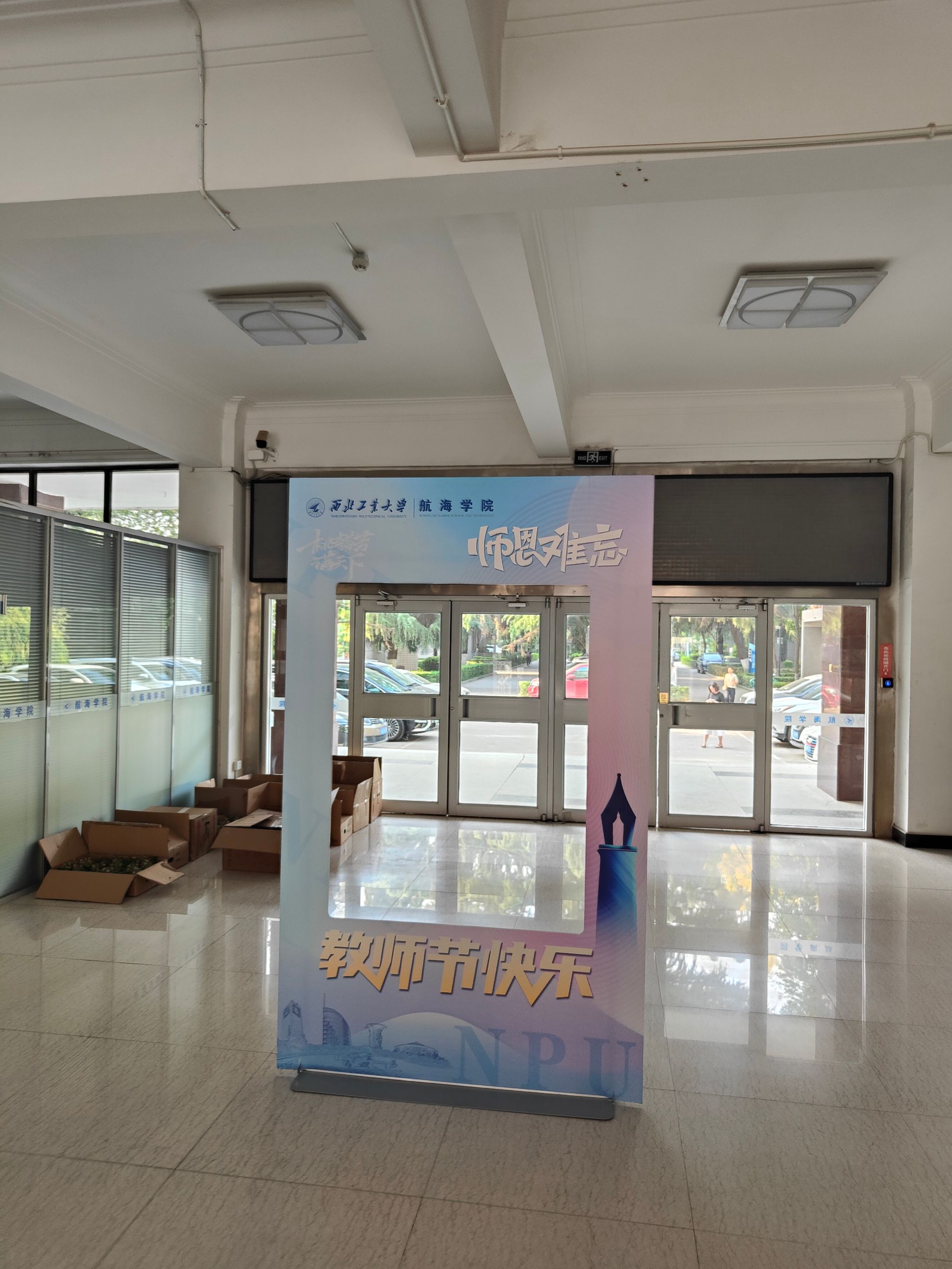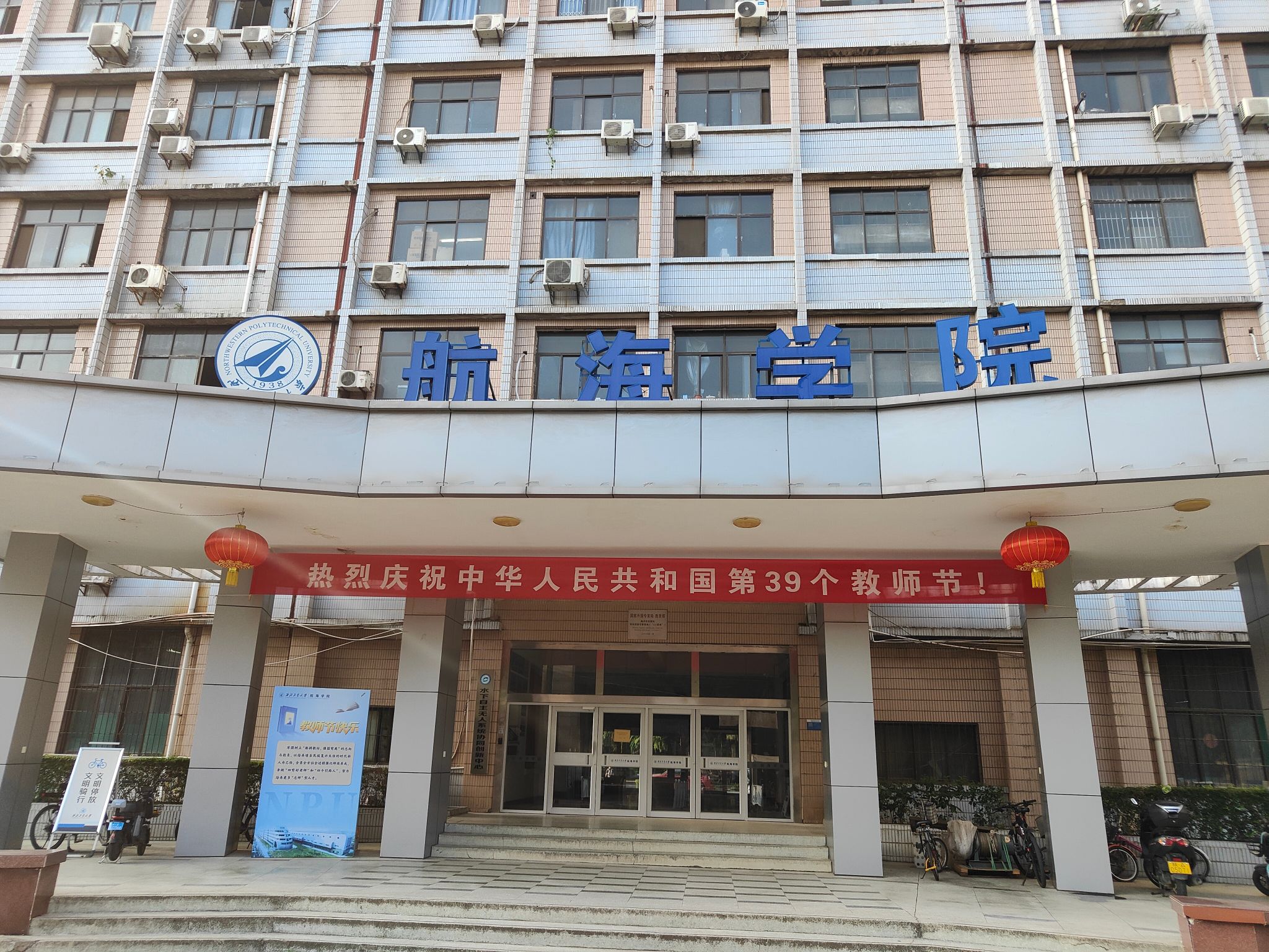 9月8日至10日在友谊校区学院办公楼前悬挂“热烈庆祝中华人民共和国第三十九个教师节”横幅,并摆放“师恩难忘”等标语师生合影背景墙。