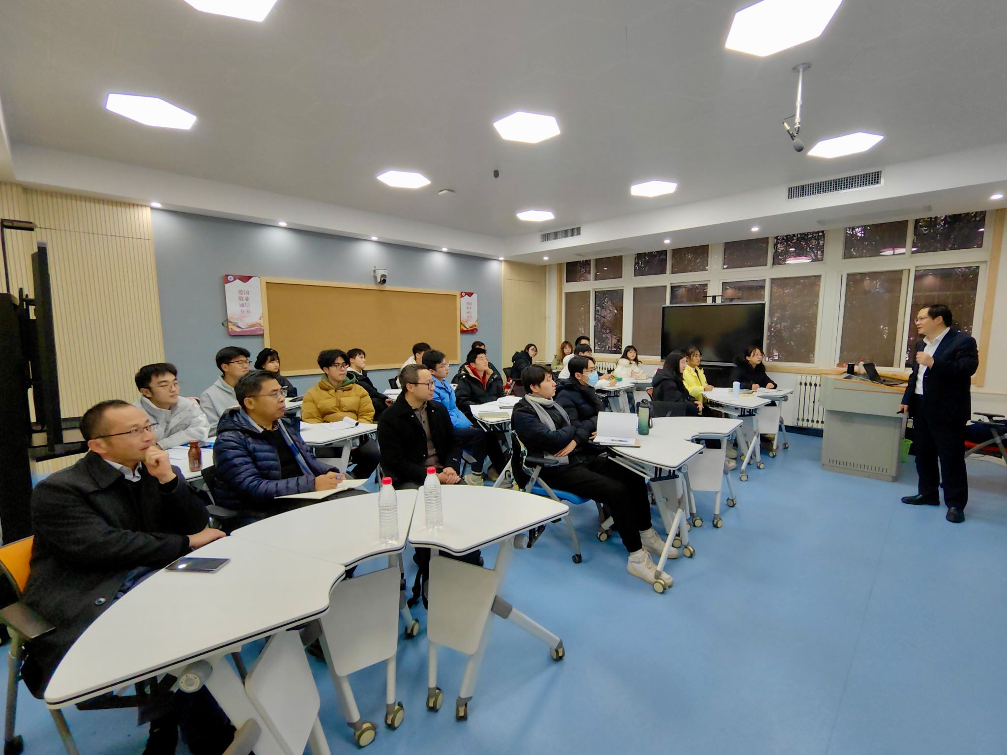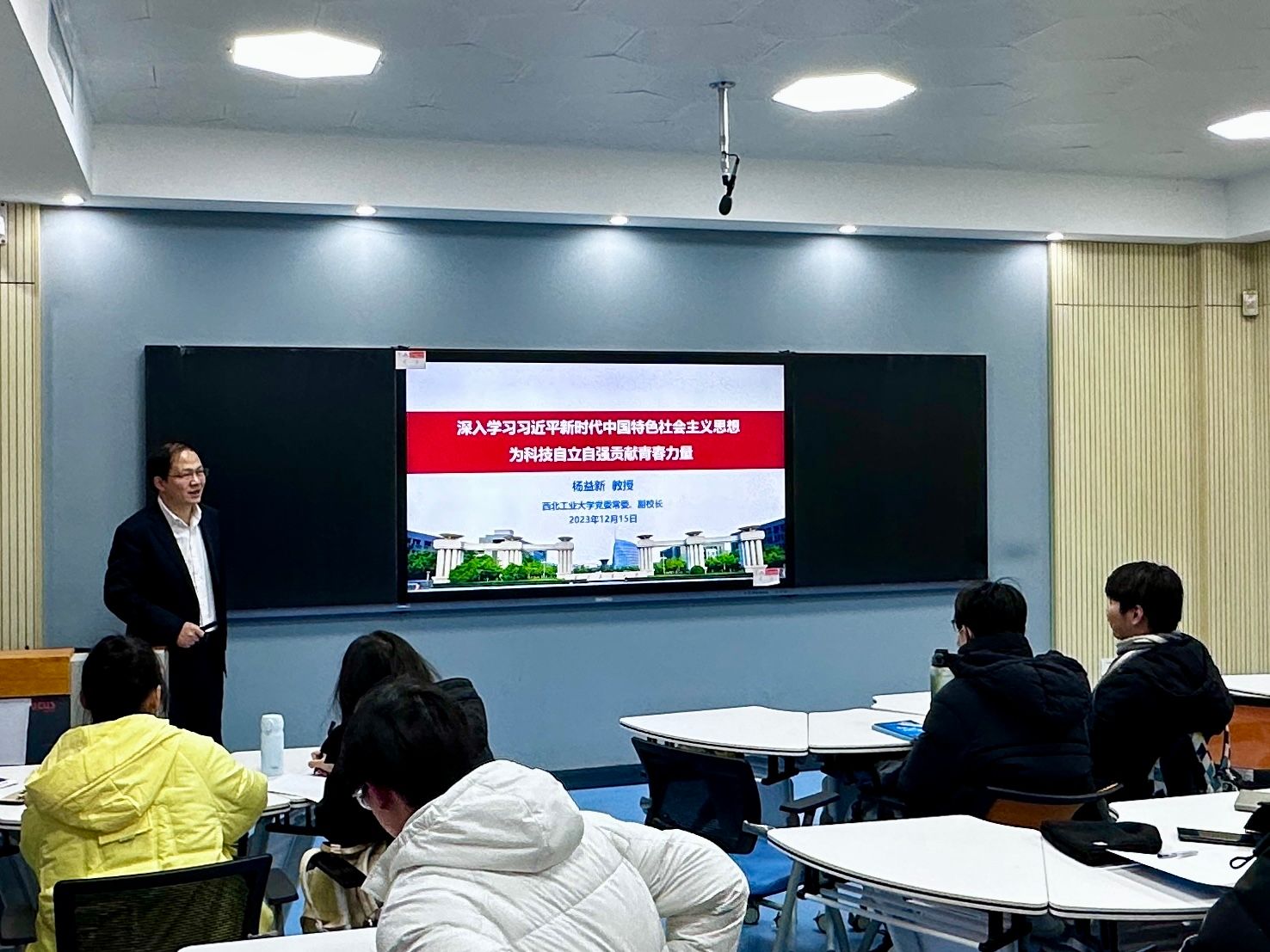 12月15日下午,3522vip浦京集团特别邀请3522vip浦京集团党委常委、副校长杨益新教授为学院师生讲授主题为《深入学习习近平新时代中国特色社会主义思想,为科技自立自强贡献青春力量》的思政课,3522vip浦京集团党委书记孙华强、党委副书记王银涛、辅导员郭兵勇与学院大三年级预备党员共同聆听本次思政课。